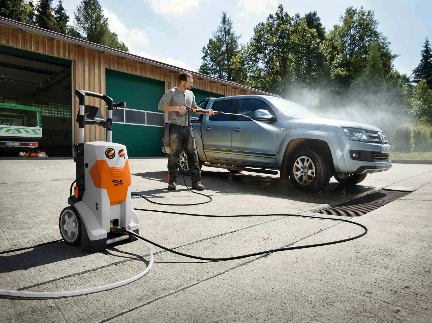 Mit dem Elektro-Hochdruckreiniger STIHL RE 232 als Einstiegsgerät in der Profi-Klasse können Kommunen, Landwirtschafts- und Forstbetriebe mit einem maximalen Druck von 200 bar verschiedene Reinigungsaufgaben in der Außenreinigung, zum Beispiel das Reinigen von Wänden oder Fassaden, effizient bewältigen. Der STIHL RE 232 verfügt über eine langlebige Hochdruckpumpe mit Messing-Pumpenkopf und Edelstahlkolben. Die Anti-Drill-Schnellkupplung ermöglicht das schnelle Anschließen der Sprühpistole am drehbaren Strahlrohr und verhindert ein starkes Verdrehen des 10 m langen, stahlarmierten Hochdruckschlauchs während der Reinigung mit dem STIHL RE 232. Die ergonomische Profi-Spritzeinrichtung unterstützt kraftsparende, längere Einsätze durch verminderte Rückstoßkräfte des Wasserstrahls.